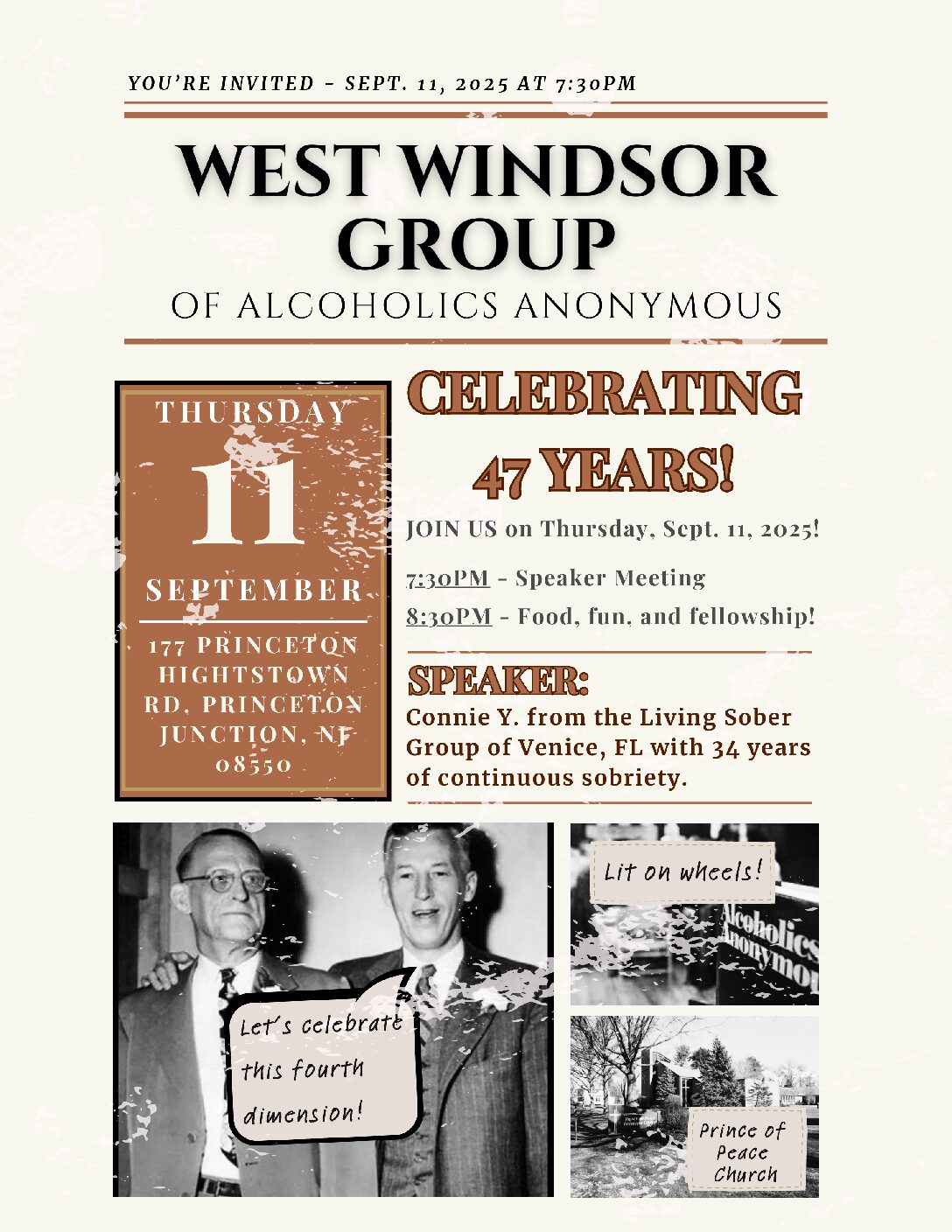 7:30pm Speaker Meeting Connie Y from the Living Sober Group of Venice, FL with 34 years continuous sobriety