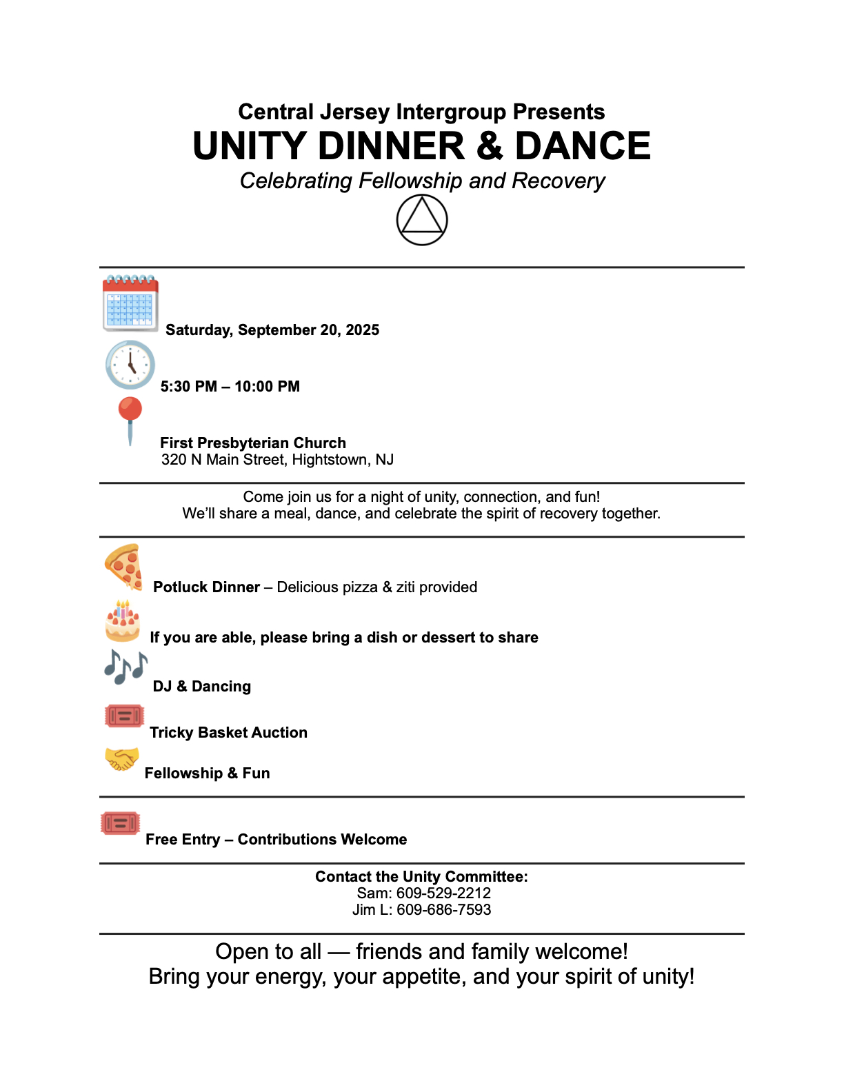 1st Presbyterian Church - Hightstown North Main Street 320, Hightstown, NJ, United StatesCentral Jersey Intergroup Presents Unity Dinner & Dance Celebrating Fellowship and Recovery